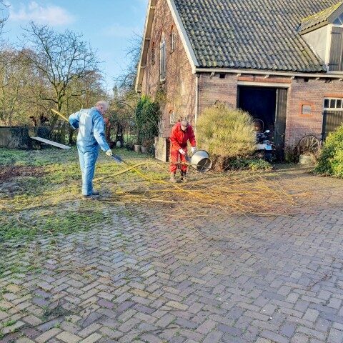 De slepers voerden vakkundig en in een continue stroom de takken af naar de afwerkplaats. Daar stonden teamleden klaar met takkenscharen en, niet geheel toevallig op de locatie van mevrouw Hiep, met een hiep. De dikke takken werden daar ontdaan van de zijtakken.