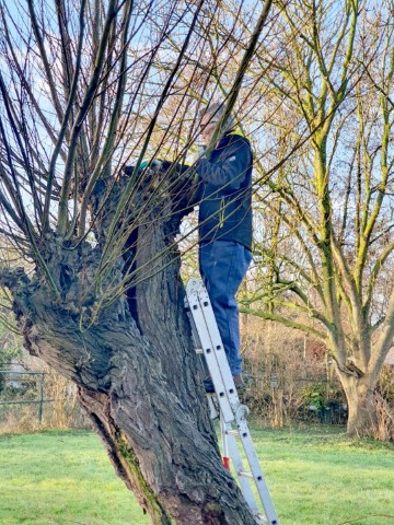 Als bij toverslag verspreidde het team zich over het terrein. Ladders werden vakkundig neergezet, op de onderste sport werd een voorzichtige eerste stap gezet…. De zon weerkaatste nog even op het zaagblad en luttele seconden later vloog het eerste zaagsel in het rond.
