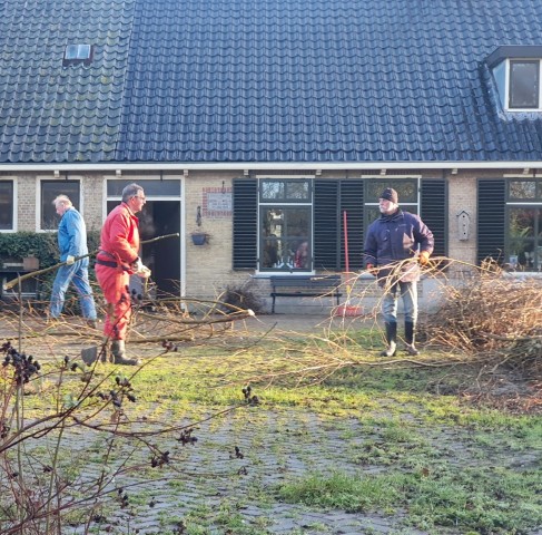 Om 9 uur stond het volledige team van deze dag opgesteld. De teamcaptain gaf nog een laatste uitleg: “alle bomen kaal maken en de takken naar het erf afvoeren”.