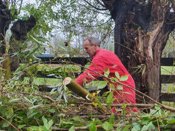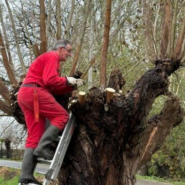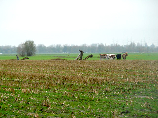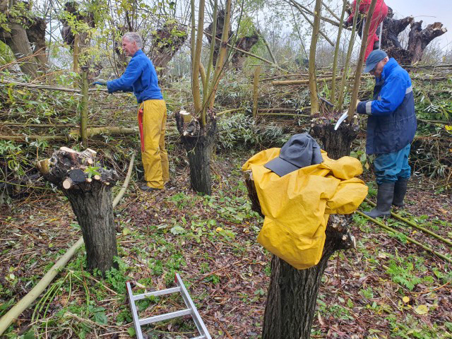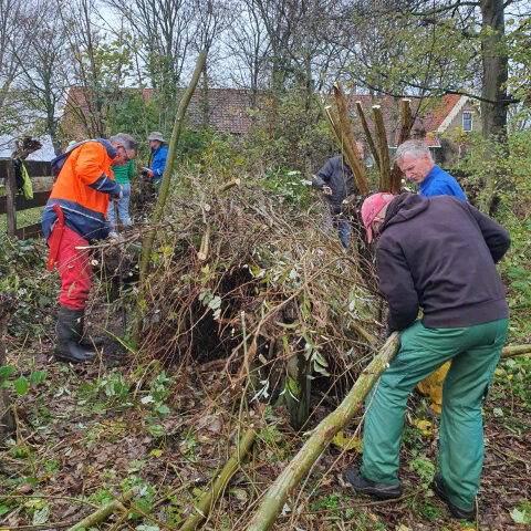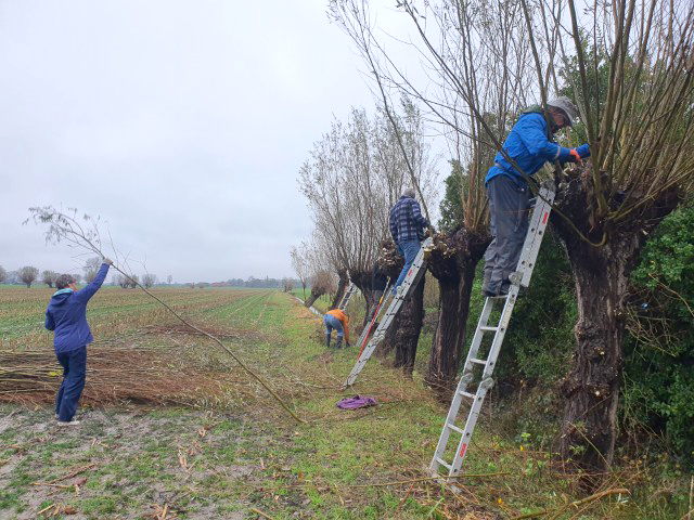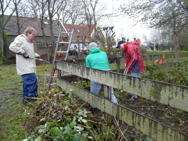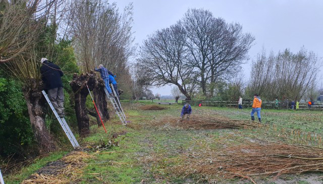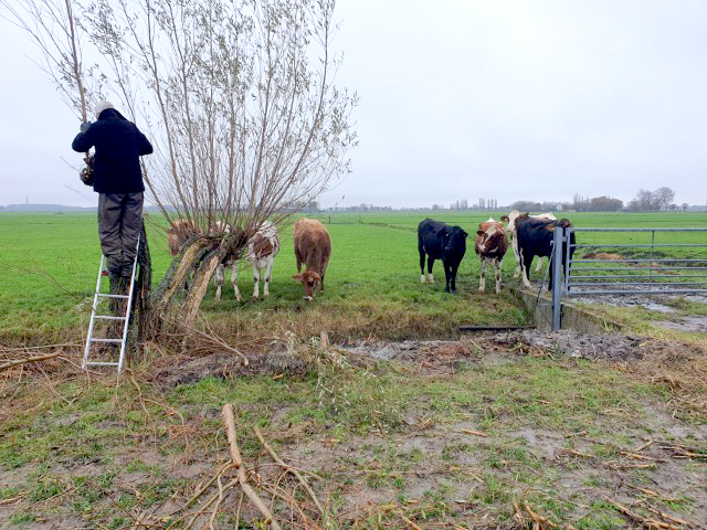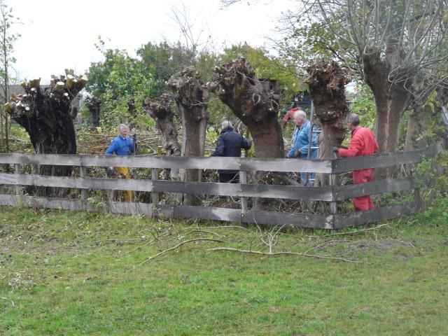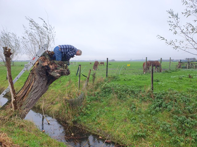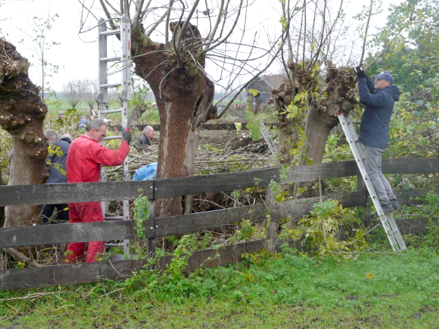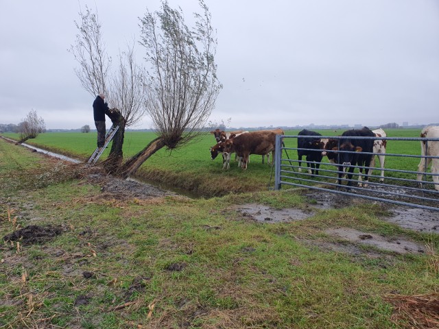 Het werken in de polder vergt èn de nodige aandacht, èn het is heerlijk ontspannend, nou ja….. je moet natuurlijk wel op je omstanders letten. Zaterdag is gewerkt aan het geriefbos en de wilgen langs de sloot op ’t land van Jaap-Jan. Een klein clubje ontfermde zich over de bomen langs de sloot. Zij kregen er een gratis poldertocht bij: de achterste boom stond een flink eind verderop in het weiland.