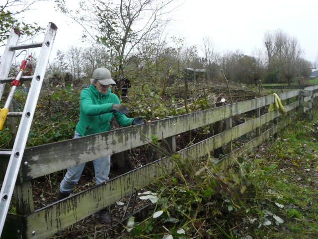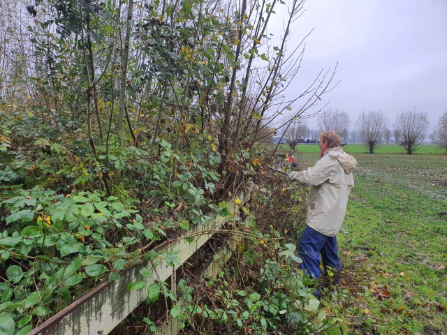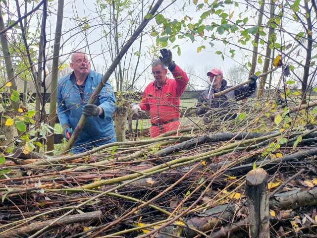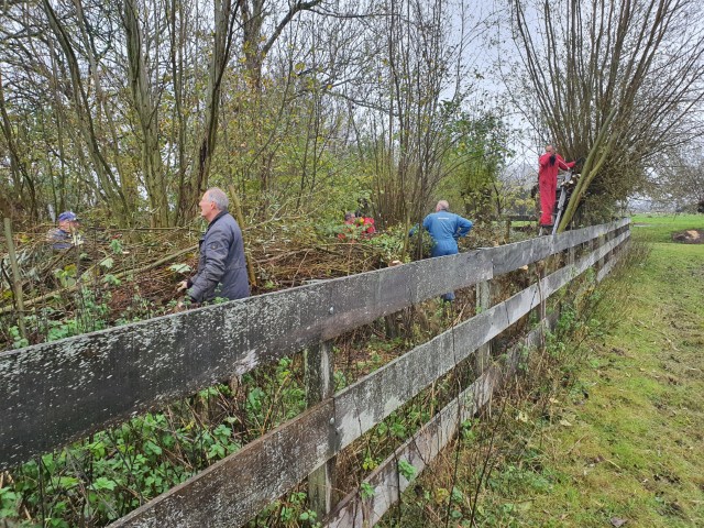 In het geriefbos, was het voor de aanwezige flora kennelijk heel gerieflijk geweest. Er stonden flinke takken op de wilgenbomen en de bramen op de grond leken wel struikeldraden (met prikkels). De aanwezige takkenril lag er uitnodigend bij èn bood voldoende ruimte om het pas afgezaagde hout op te nemen. Waar de één hoog in een boom aan het zagen was, stond een ander met beide benen op de grond gaten te boren om de takkenril te verstevigen.