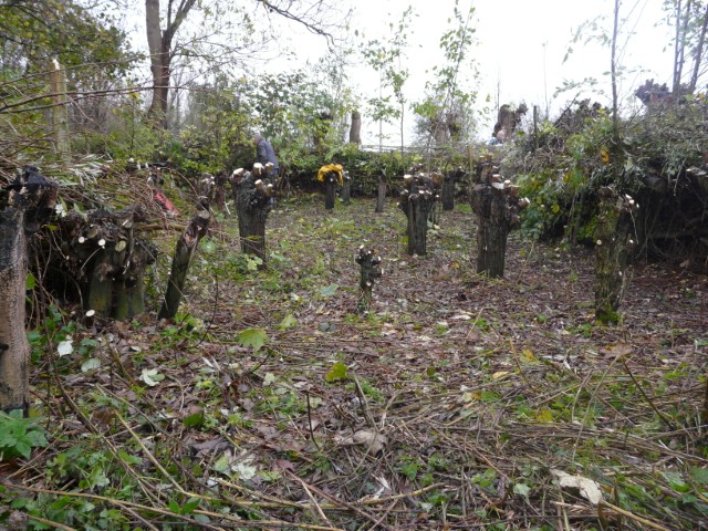Toen ik op weg naar huis nog even omkeek, zag ik langs de slootkant een mooie, strakke, vers geknotte bomenrij en even verderop een geriefbos waar weer volop licht bij kon. Er was weer flink wat werk verzet.